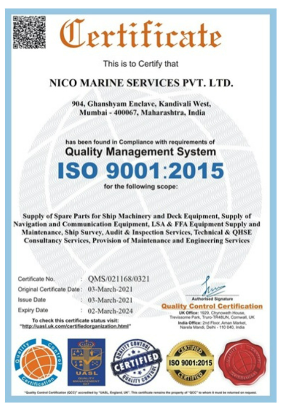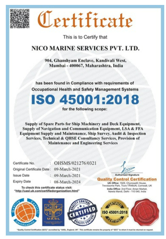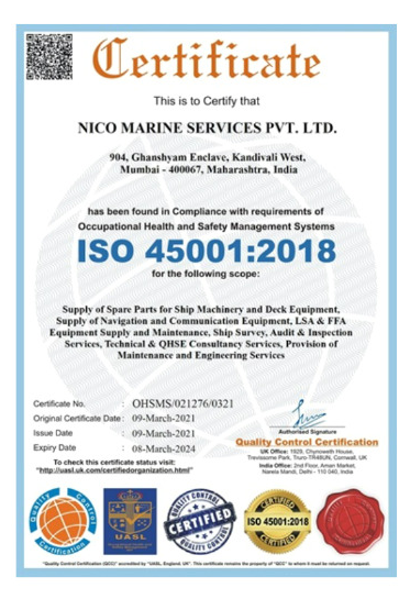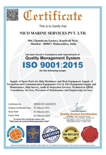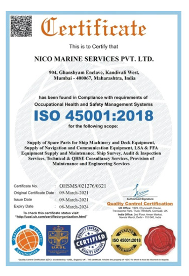 NICO Marine is committed to the highest standards of quality in all its activities, and as a result, have been certified by the International Standards Organization (ISO). To demonstrate our commitment, we actively pursue compliance and registration with the relevant ISO standards and have been awarded ISO 9001, ISO 29001 and ISO 45001 certifications. Achieving these internationally recognized certifications demonstrates the ability to consistently provide products & services that meet applicable regulatory requirements and aims to enhance customer satisfaction..